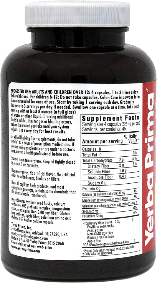 Yerba Prima Colon Care Capsules - 360 Count, Gluten Free, Made in USA, Non-GMO, Soluble & Insoluble Fiber for Healthy Colon