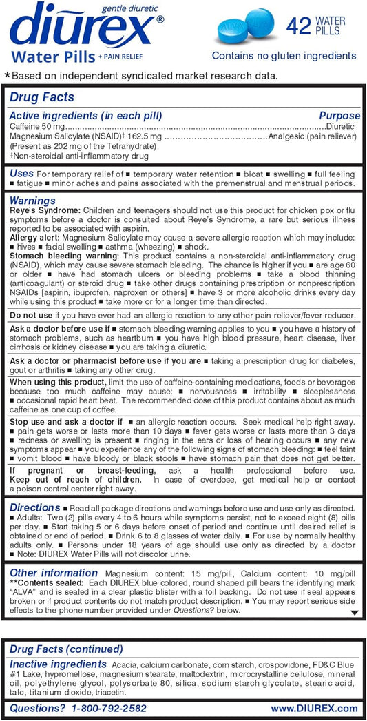Diurex Water Pills 42 Count - Effective Diuretic for Bloating and Water Retention - Fast-Acting Relief for Men and Women