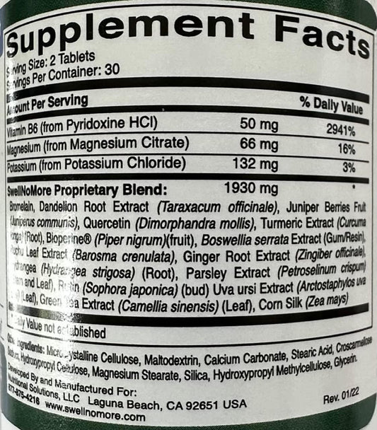 Water Retention Relief Dietary Supplement - Swell No More, 60 Tablets - Reduce Puffiness, Edema, Swelling