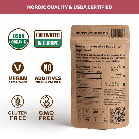 Organic Atlantic Dulse Flakes - Premium Quality Young Baby Seaweed from North Atlantic, Vacuum Dried for Soft Texture & Mild Taste. Packed with Vitamins & Minerals, 30 Servings