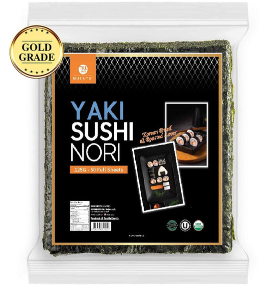 Organic Yaki Sushi Nori Sheets (NuEats) - 50 Full Sheets, Gold Grade, Roasted Seaweed from South Korea - USDA Organic & Kosher - Premium Quality, Resealable Packaging