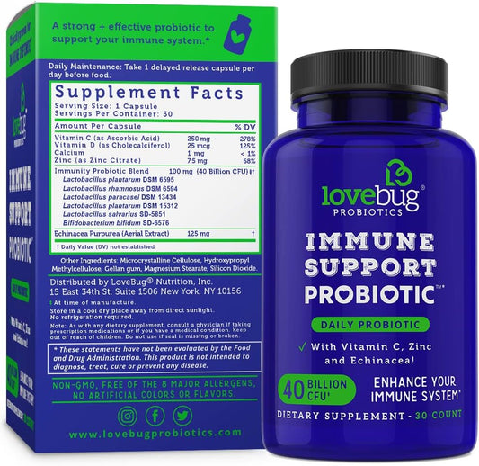 Immune Support Probiotic with 40 Billion CFU, 6 Strains, Vitamin C, Zinc & Echinacea for Men & Women - 30 Capsules, Vegan & Non-GMO