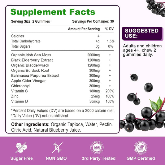 Blueberry Elderberry Gummies with Sea Moss, Bladderwrack, Echinacea, Apple Cider Vinegar - Vitamin C, D & Zinc Immune Support Supplement for Women, Men, Adults and Kids - 60 Ct