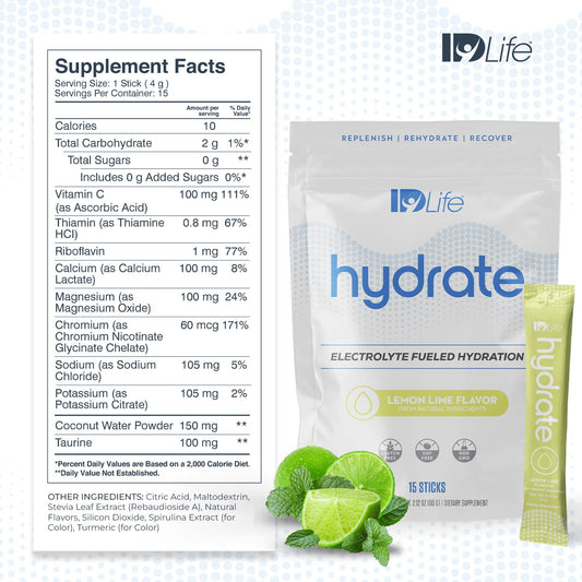 IDLife Lemon Lime Hydrate Drink Powder - Electrolyte-Rich Hydration with Vitamins, MCTs, and Minerals - 15 Sticks