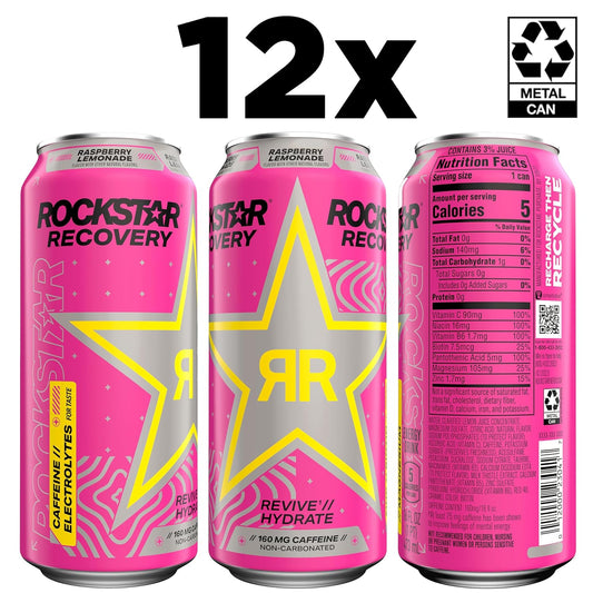 Rockstar Recovery Raspberry Lemonade Energy Drink - 12 Pack of 16 fl oz Non-Carbonated Cans with 160mg Caffeine, B Vitamins, and Electrolytes for Hydration and Mind-Body Energy Boost