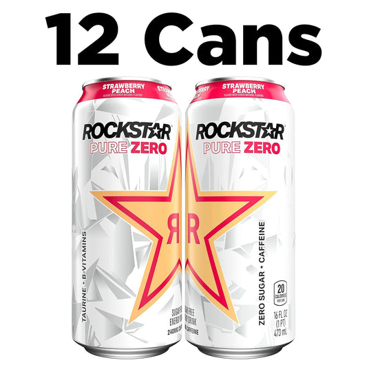 Rockstar Pure Zero Strawberry Peach Energy Drink 16oz Cans (12 Pack) - Sugar-Free with Caffeine and Taurine Boost