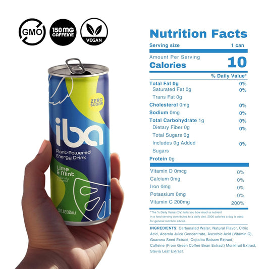 Lime Mint iba Healthy Energy Drink - Sugar-Free, Plant-Based, Sparkling Beverage with Guarana & Copaiba for Immune Support - Low Calorie, Non-GMO, Functional Energy Boost - 150mg Caffeine, 12oz (12 Pack)