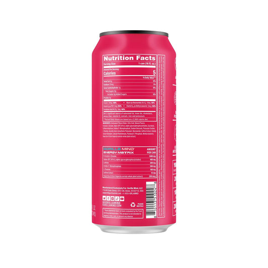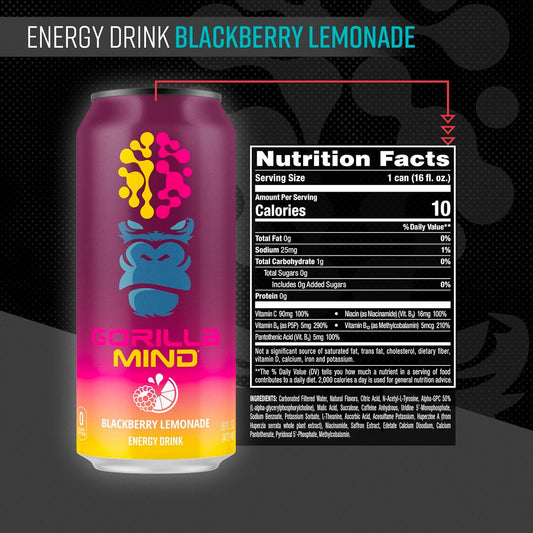 Gorilla Mind Energy Drink - Boost Energy and Focus with Nootropic Ingredients - Zero Sugar, 16oz, 12-Pack (Blackberry Lemonade)