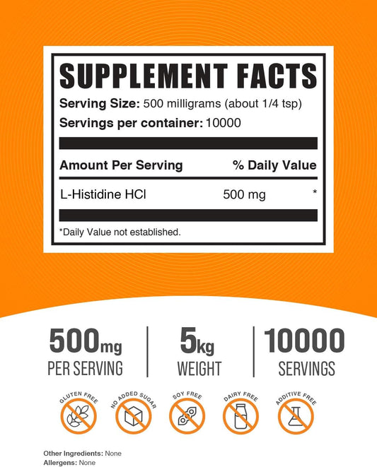 BulkSupplements L-Histidine HCl Powder - 500mg Essential Amino Acid Supplement, Gluten Free, 5kg (11 lbs) - Pack of 5
