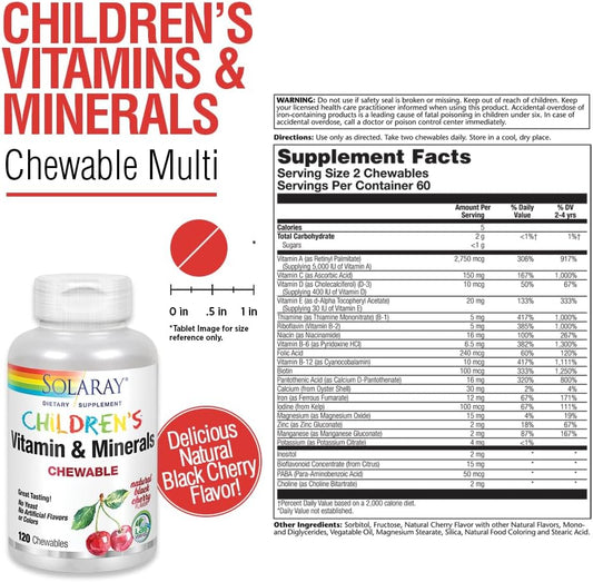Children's Multivitamin & Mineral Chews - Black Cherry Flavor - 120 Chews, 60 Servings - Solaray