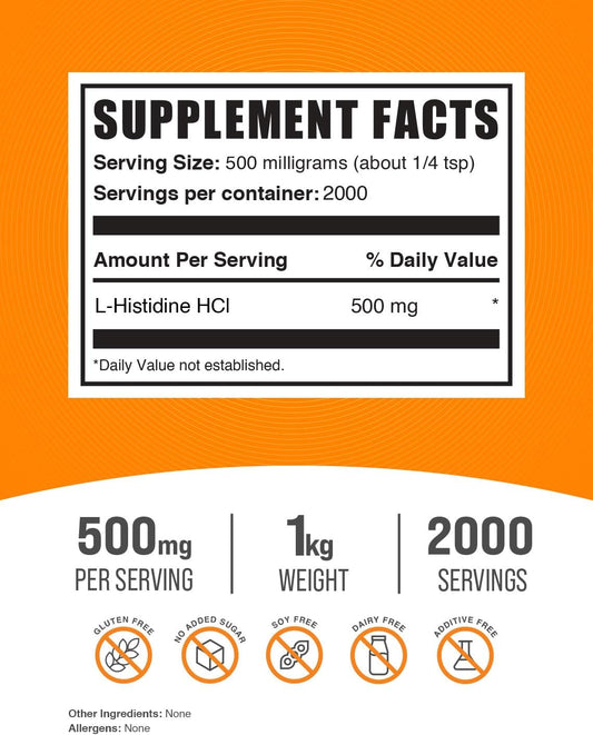 BulkSupplements.com L-Histidine HCl Powder - 500mg Essential Amino Acid Supplement, Gluten Free, 1kg (2.2 lbs) - Pack of 1