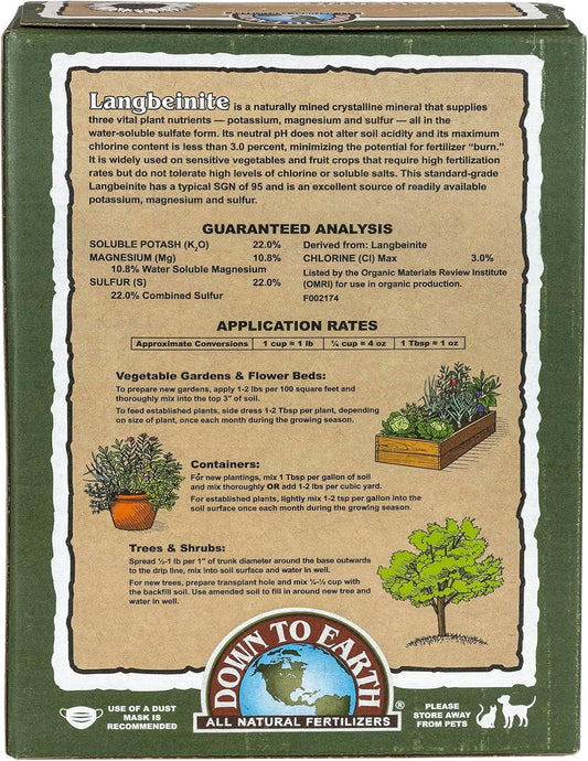 Down to Earth Organic Langbeinite Fertilizer Mix 0-0-22 Granules, 5 lb - All Natural Fertilizer Pack for Healthy Plants