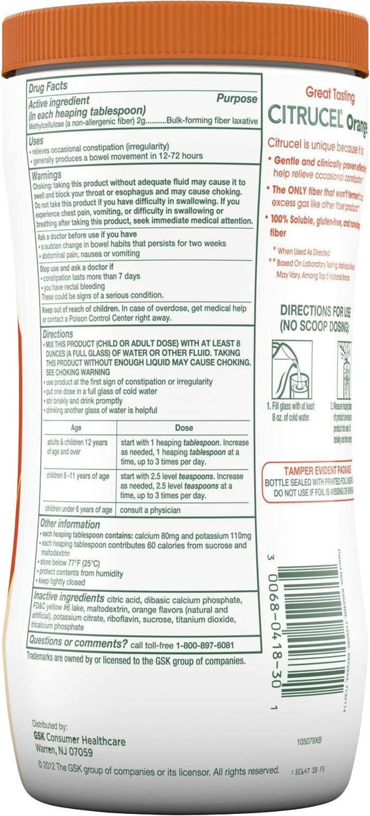 Citrucel Powder Orange Flavor 30 oz - Pack of 4 - Digestive Health Supplement with Natural Orange Flavor