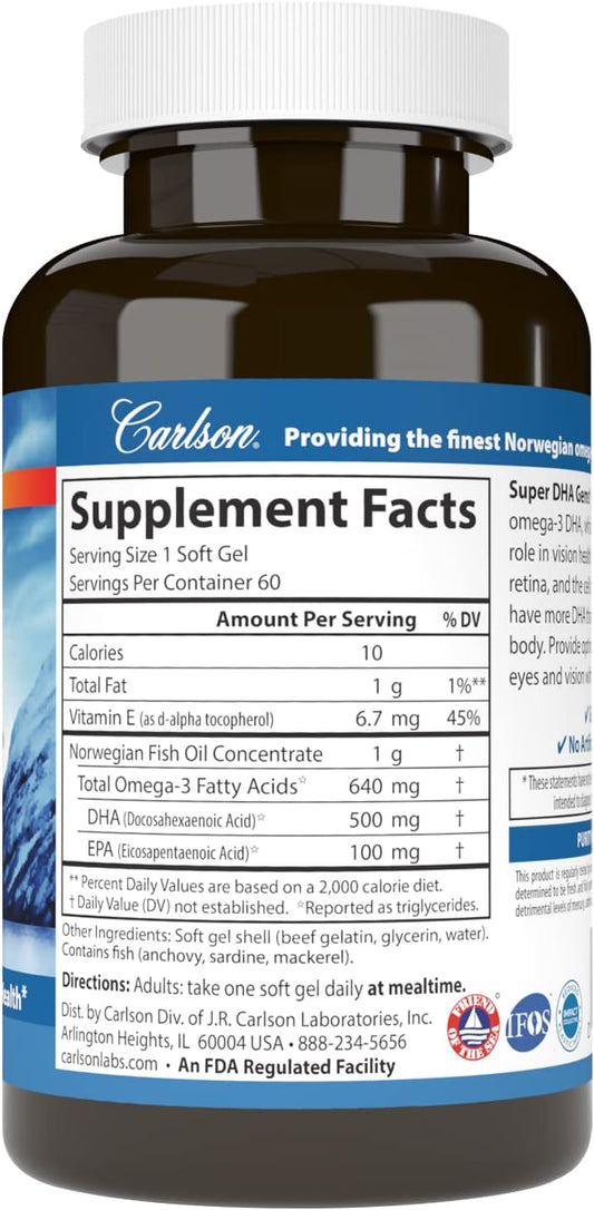 Carlson Super DHA Gems 500mg Supplement - Norwegian Fish Oil Capsules for Cognitive Health - 60 Softgels