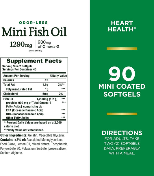 Omega-3 Fish Oil Softgels 1290mg, Heart Health Support, Odorless, 90 Mini Coated Softgels