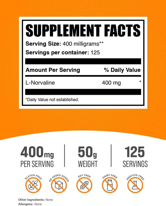 BulkSupplements L-Norvaline Powder - Nitric Oxide Amino Acid Supplement - Gluten Free, 400mg per Serving, 50g - 1.8 oz Pack