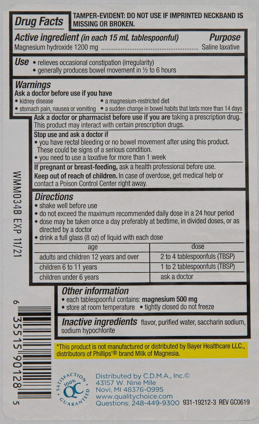 6-Pack Quality Choice Mint Flavor Milk of Magnesia 12 Fl Oz - Gentle Relief for Indigestion & Constipation