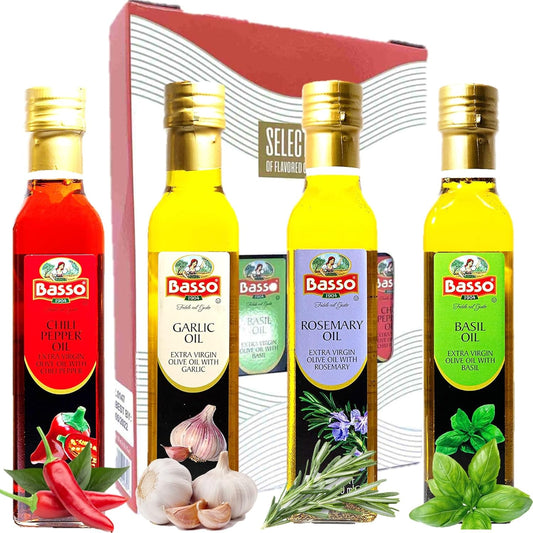 BASSO 1904 Infused Extra Virgin Olive Oil Gift Box Set - First Cold Pressed Variety Pack - 4 Bottles x 8.5 fl.oz (250ml) - Naturally Infused for Dipping & Tasting