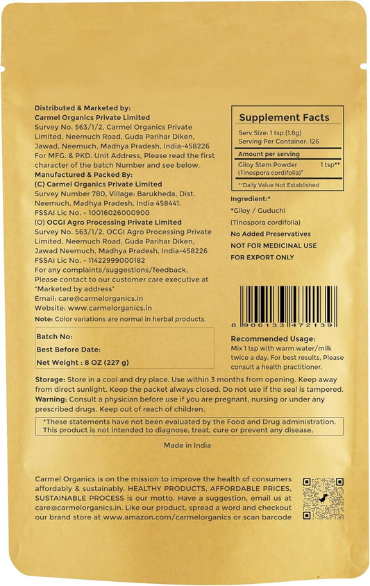 Organic Giloy Stem Powder - 8 Ounce (0.5 LBS) Pack | Pure & Natural | Non-GMO Tinospora Cordifolia Herbal Supplement for Immunity Boost