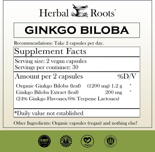 Organic Ginkgo Biloba Supplement - 1,400mg per Serving, 60 Vegan Capsules - Herbal Roots Formula