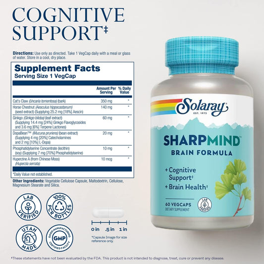 Solaray SharpMind Cognitive Support Formula with Ginkgo Leaf, L-Dopa, Huperzine A - Brain, Mood, and Memory Support - 60 VegCaps