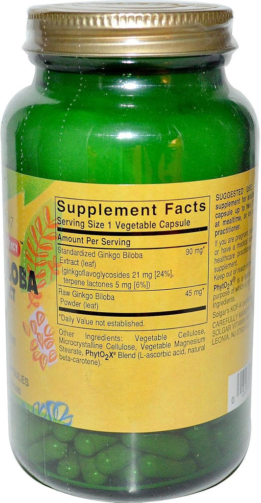 Solgar Ginkgo Biloba Supplement - 180 Vegetarian Capsules with Full Potency & Standardized Extract