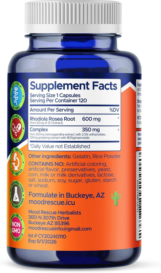 Rhodiola Rosea & Ashwagandha Capsules for Stress Relief & Stamina, 120ct with Ginseng & Ginsenoside