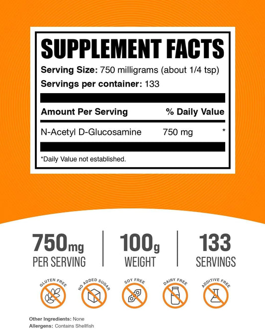 Gluten-Free N-Acetyl Glucosamine Powder - 100g (3.5 oz) - 750mg per Serving - Bulk Supplement for Joint Health - Pack of 1