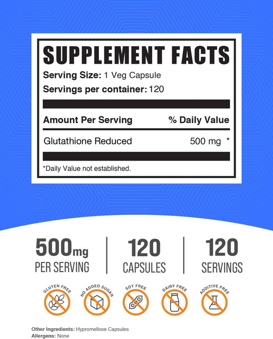 BulkSupplements Reduced Glutathione Capsules - 500mg, Gluten Free, 120 Capsules - Glutathione Supplement with 1 Capsule Per Serving