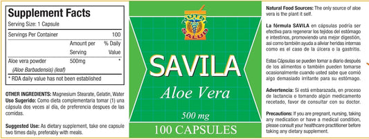 Aloe Vera Capsules 500mg - Set of 2 Bottles, 100 Capsules Each. Effective for Ulcers, Heartburn, Digestion, Colitis, Constipation. Lasts Over 3 Months. Nutrisalud Products.