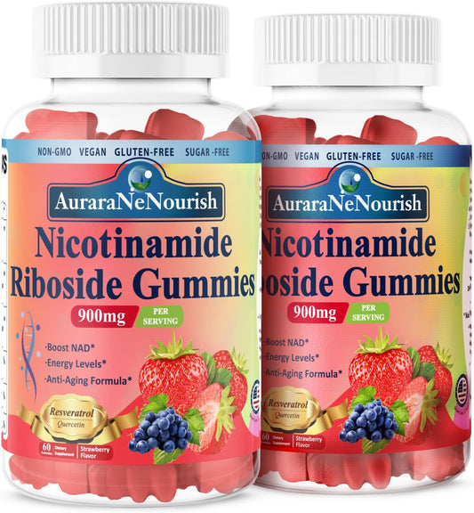2 Pack AuraraNeNourish NAD Resveratrol Gummies with Quercetin, Collagen, Vitamin Support - Anti Aging, Energy Boost, Skin Improvement - Sugar Free Nicotinamide Riboside 900mg Supplement