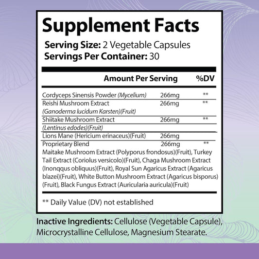10-in-1 Mushroom Supplement Capsules for Memory, Focus, Immune Support & Energy - Lionโs Mane, Reishi, Cordyceps, Chaga, Turkey Tail & More - 60 Caps