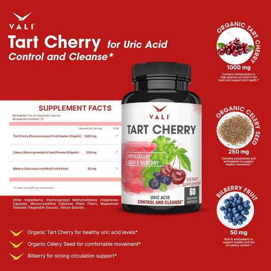 Organic Tart Cherry Uric Acid Cleanse Supplement with Celery & Bilberry Extracts for Joint Support & Muscle Health - 60 Capsules