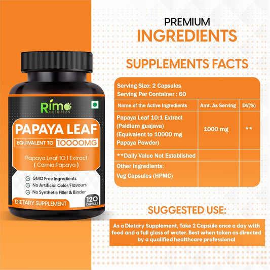 Premium Papaya Leaf Extract Capsules - High Potency 10:1 Formula - 120 Count - Rimo Nutrition