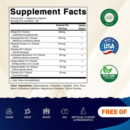 Extra Strength Shilajit Complex Capsules with Ashwagandha, Rhodiola, Ginseng, Cordyceps, Ginkgo, Nettle, Turmeric - 120 Veggie Capsules for Men & Women