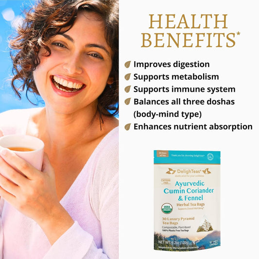 Organic CCF Tea with Cumin, Coriander, Fennel | Digest & Detox Blend | Eco-friendly Pyramid Tea Bags | USDA Organic, Caffeine Free | 30 Bags, 4g