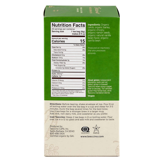 Teeccino French Vanilla Herbal Tea - Caffeine-Free & Prebiotic with Natural Energy Boost - Coffee Alternative - 25 Count