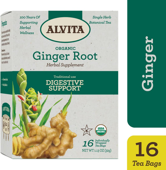 Organic Ginger Root Herbal Tea - Caffeine Free Nausea Relief, Immunity, and Digestive Aid - 16 Tea Bags