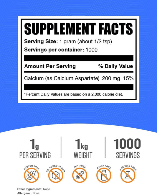 BulkSupplements.com Calcium Aspartate Powder - High-Potency Calcium Supplement - Gluten-Free Powder with 1000mg (200mg Calcium) per Serving - 1kg (2.2 lbs) Pack