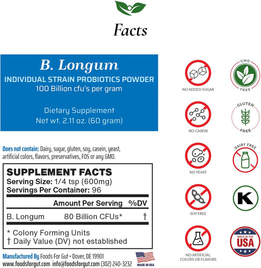 B. Longum Probiotic Powder 100 Billion cfu's | USA Made | No Additives | Digestive & Immune Support | High Potency | 60g