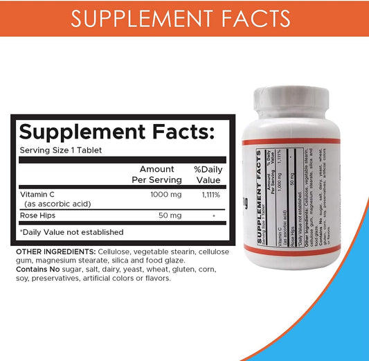 1000mg Holistic Health Vitamin C Tablets with Rose HIPS for Immunity Boost & Blood Pressure Support - 100 Tablets