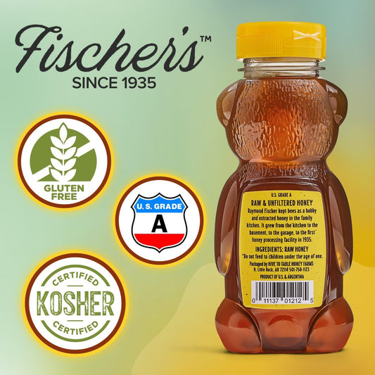 Fischer's 100% Clover Honey 12 Oz Squeezable Bear Bottle - Pure Raw Unfiltered Honey - Gluten-Free Non-GMO All-Natural Sweetener