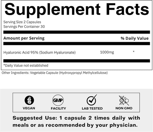 High Purity Hyaluronic Acid Capsules - 500mg Sodium Hyaluronate - Purified & Bioavailable - Low Molecular Weight - Non-GMO - 60 Capsules