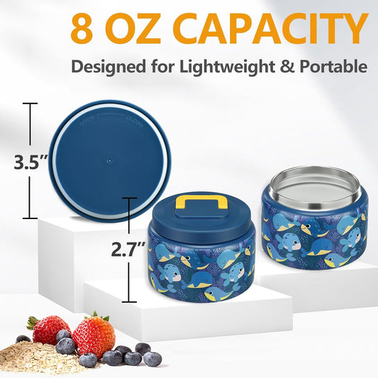 Kids 8oz Thermo Food Container - Stainless Steel Lunch Thermos for Hot/Cold Food - Easy Open Wide Mouth - Ideal for Preschool Travel - Blue Whale Design