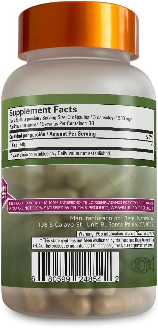 Betel Natural Algas Marinas/Kelp Capsules - 1000mg per Serving - Rich in Natural Iodine and Sea Nutrients - 90 Capsules