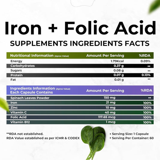 Iron Folic Acid Supplement with Zinc, Vitamin C & B12 - 60 Veg Tablets for Men & Women | Promotes Haemoglobin Production, Immunity, & Iron Levels