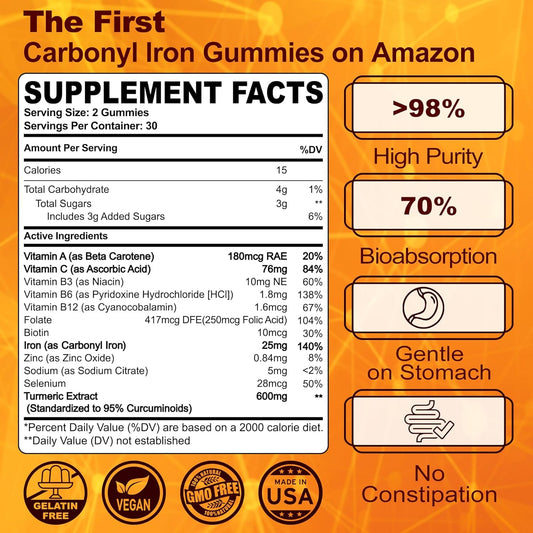 Iron Gummies with Turmeric, Vitamin C, B12 for Men & Women - Non-Constipating Iron Supplement 25mg - Vegan, Gentle & Effective - 2 Pack for Anemia & Energy Boost