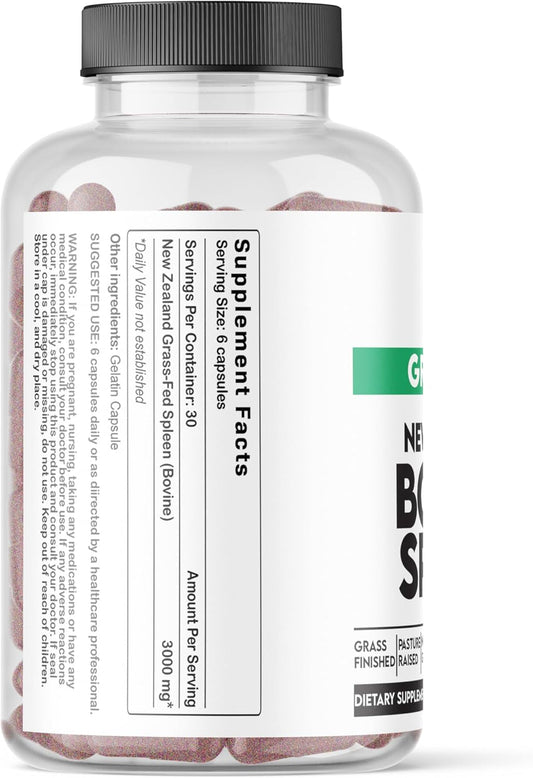 Premium New Zealand Grass Fed Beef Spleen Supplement - 100% Pure Bovine Capsules with Heme-Iron - Non-GMO, Freeze Dried, Raw - 180 Caps