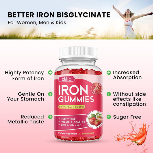 Iron Gummies with Multivitamin for Men and Women - Vegan Iron Supplement with Zinc, Vitamin B Complex, C, B12, Folate - Energy Support and Blood Builder - Strawberry Flavor - 60 Gummies