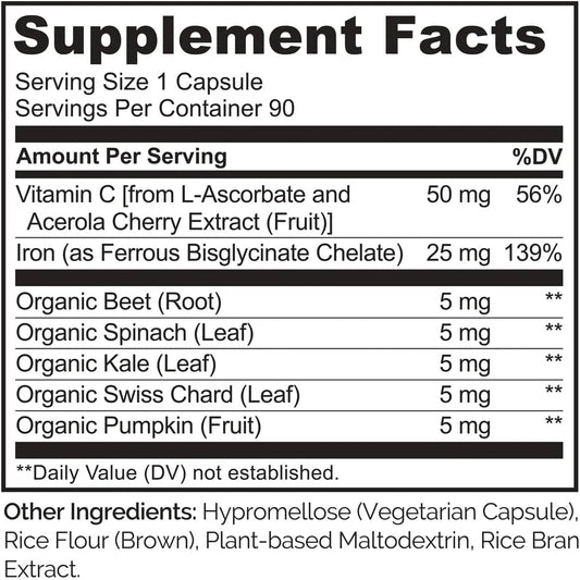 Organic Iron and Folic Acid Supplement with Zinc, Vitamin C, and B12 - 60 Veg Capsules for Immunity and Energy Boost - Supports Blood Health and Absorption - Men and Women Formula